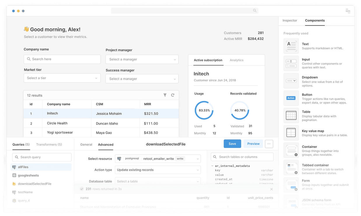 Retool is easy to extend — Because building tools in Retool is so easy (a typical one takes just a few minutes), it’s easy to build new tools on top of Retool. So if you need a tool specifically for managing a sign-up workflow (e.g., you’re a bank and need to approve a customer’s ID before sending out their card), you can build it in Retool in minutes, as opposed to days.