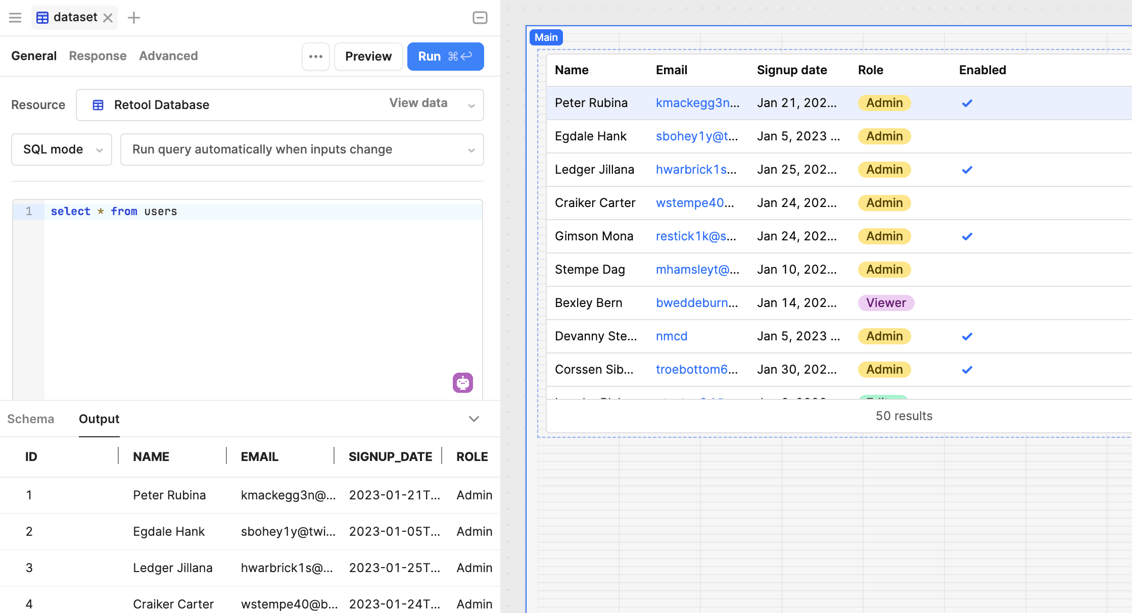First, drag the Retool Table component onto the canvas—then let’s get some data. We're using the “sample_users” table included in Retool Database to create a simple example that’s easy to grasp, allowing you to extend it further for your specific use case.