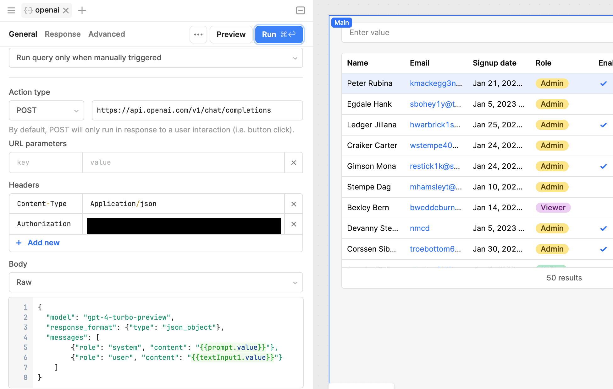You’ll need a free Retool account and an OpenAI API key (with active credits) in order to ask GPT-4 to convert the user text into an SQL string.