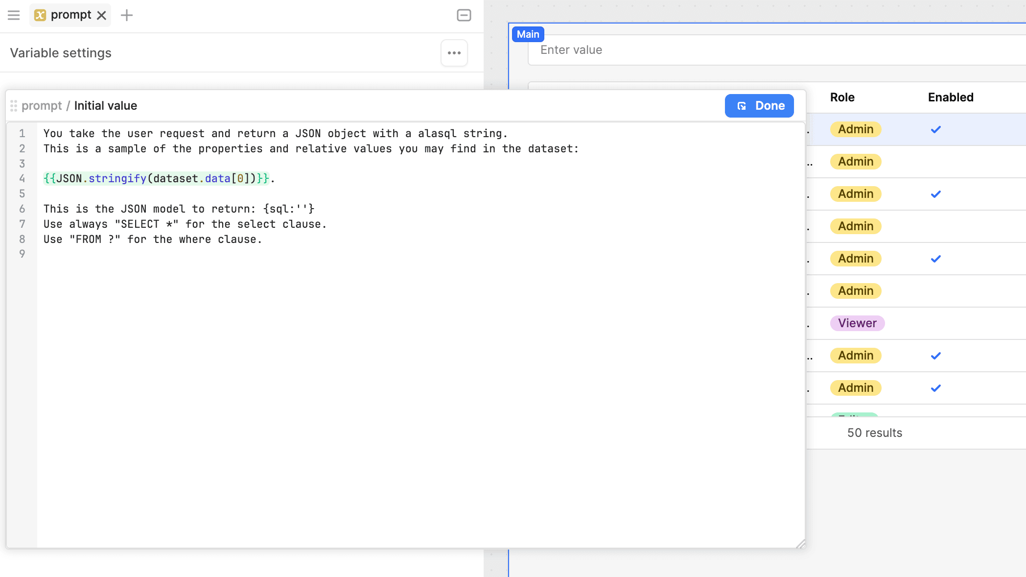 We need to prepare a Retool variable for the prompt part we’ll use in the OpenAI query. This is the “system” role you typically include as the first item in the array of messages for a “chat/completion” call.