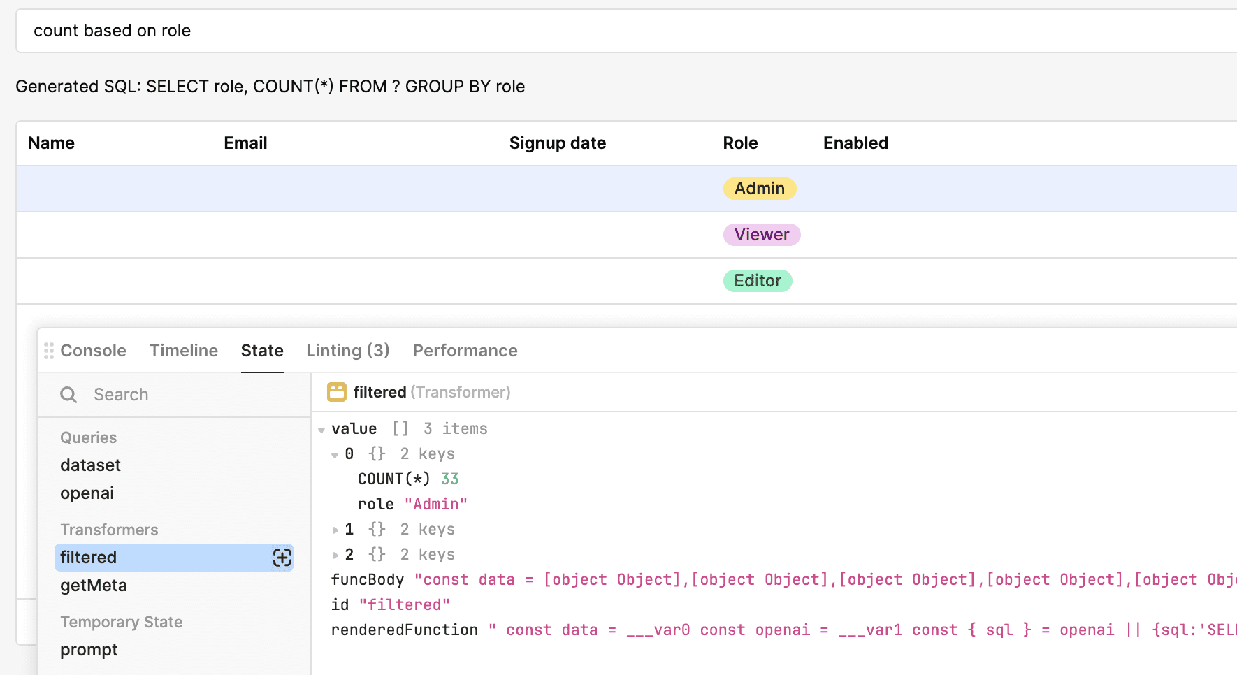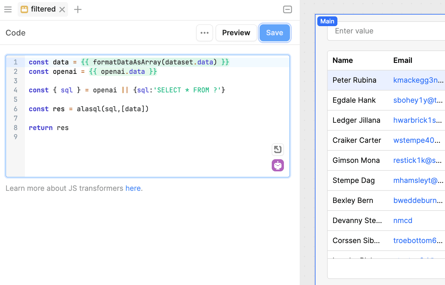 Doing this should be pretty self-explanatory—we basically take the original dataset and filter it using AlaSQL, which is already included in Retool.