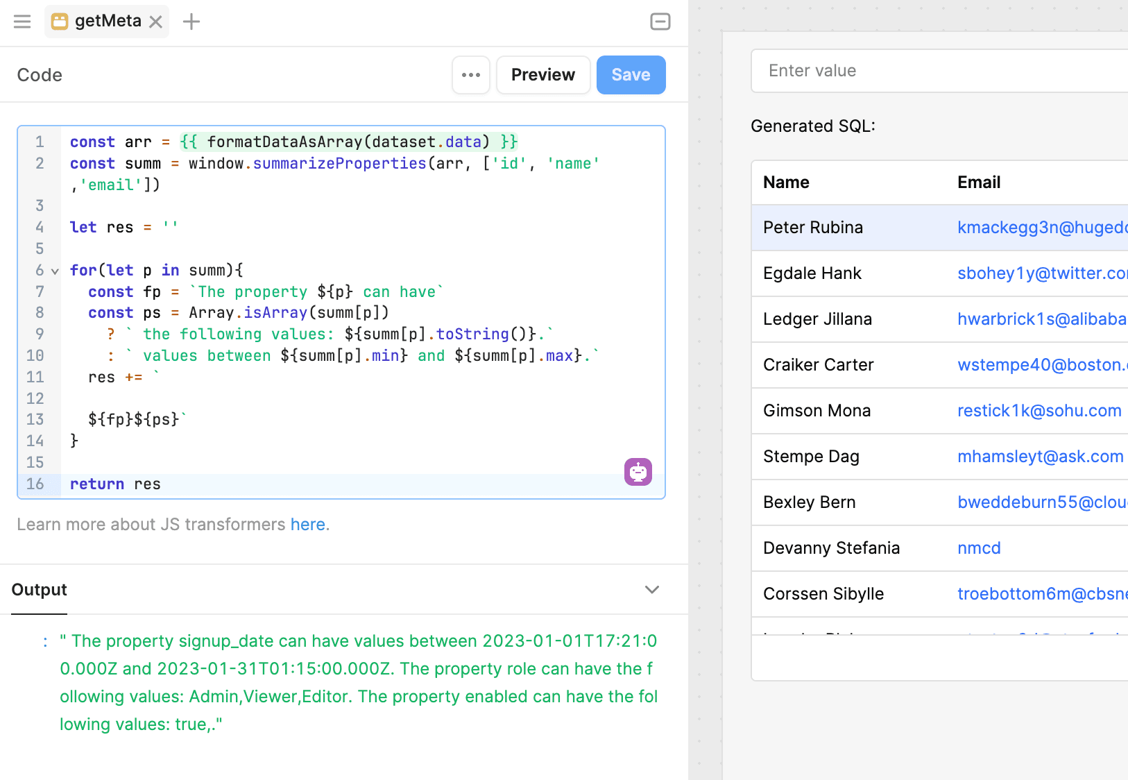 getMeta is a Retool Transformer that returns information about the dataset. In our sample dataset, this information can include: