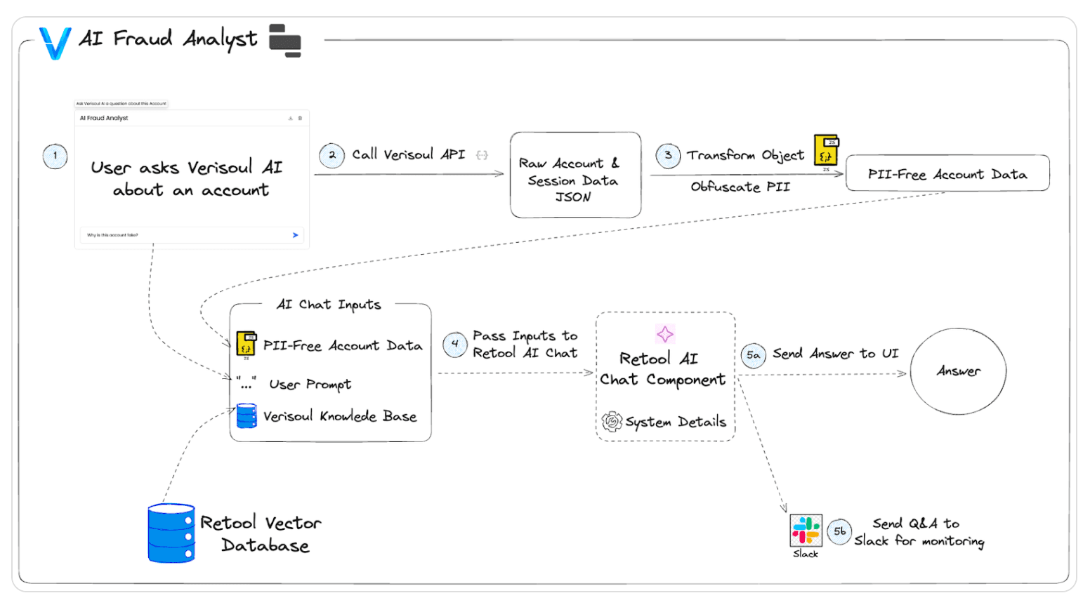 The Verisoul AI Fraud Analyst provides simple, real-time answers to customer questions about accounts and their risk profiles. When a question enters the Retool AI-powered chat interface, several steps occur programmatically behind the scenes: