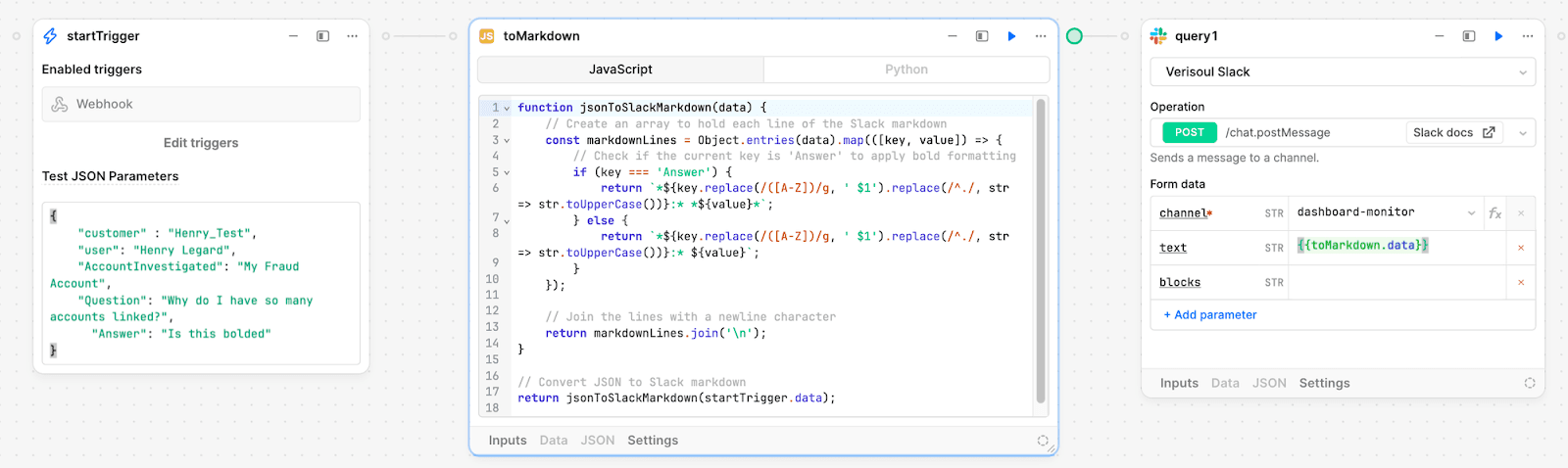 This code block simply formats the response we get from the Retool AI Fraud Analyst and readies it to send to Slack in a readable way.