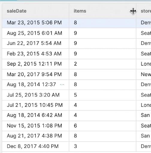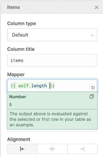 Similarly, rather than seeing all items in the “Items” column (which came as an array of JSON objects for each of the items in the order), we can choose to simply display the number of items in the order by using `{{self.length}}`