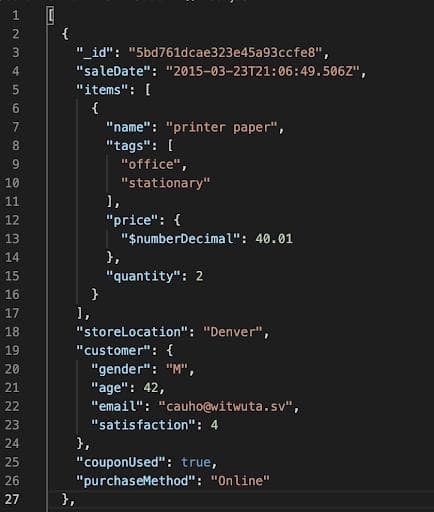 Back to our sample app: we connected to our MongoDB Atlas instance, where we’ve preloaded sample datasets that come with MongoDB. We’ll work with MongoDB’s “sales” sample set: it contains around 5000 sales orders, each including items like prices, quantities, customer information, whether a coupon was used, and when the order happened: