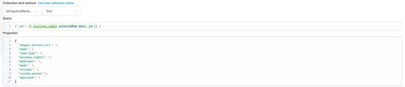 We’ll start by creating a new query and name it “selected_listing” in the bottom query pane. If you got rid of it to move components around, you can always bring it back by clicking the little bottom bar icon at the top right of your screen. Use the same options as before: select the “listingsAndReviews” collection and the “find” method. This time, we’ll use Retool to choose the selected row of the listings table: