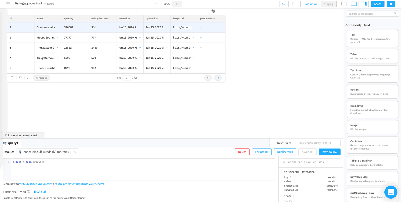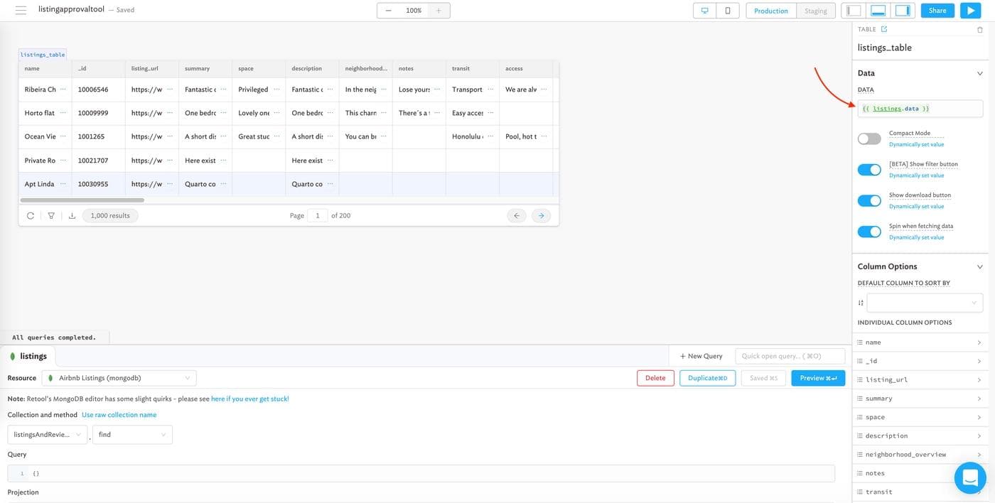Now that we have a query, let’s connect it to our table: click on the table component, and the properties should show up on your right sidebar; in the “data” field, put a reference to the “listings” query with {{ listings.data }}