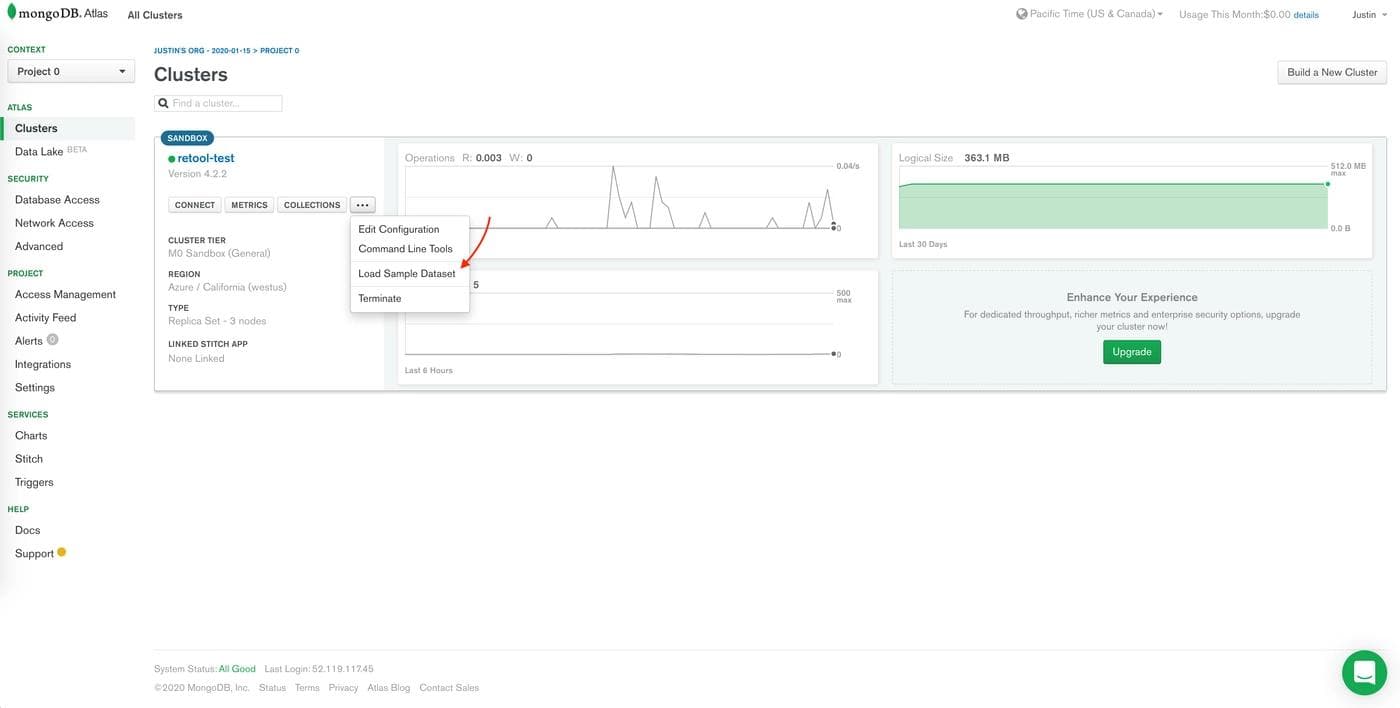 dataset. MongoDB Cloud has a pretty generous free tier and great documentation, so you’re in good hands. If you already have a cluster up and running, you can add sample datasets to it through clicking on the 3 dots on your cluster homepage, and selecting “Load Sample Dataset.”
