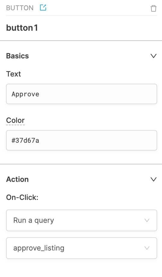 Now let’s hook them up to the right buttons: click on each button, and in the right sidebar in the action section, choose the right query from the dropdown. For the approve button we’ll choose the approve_listing