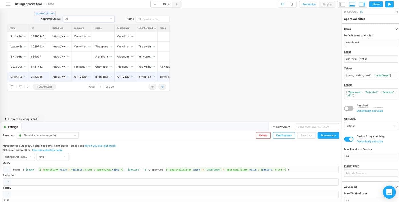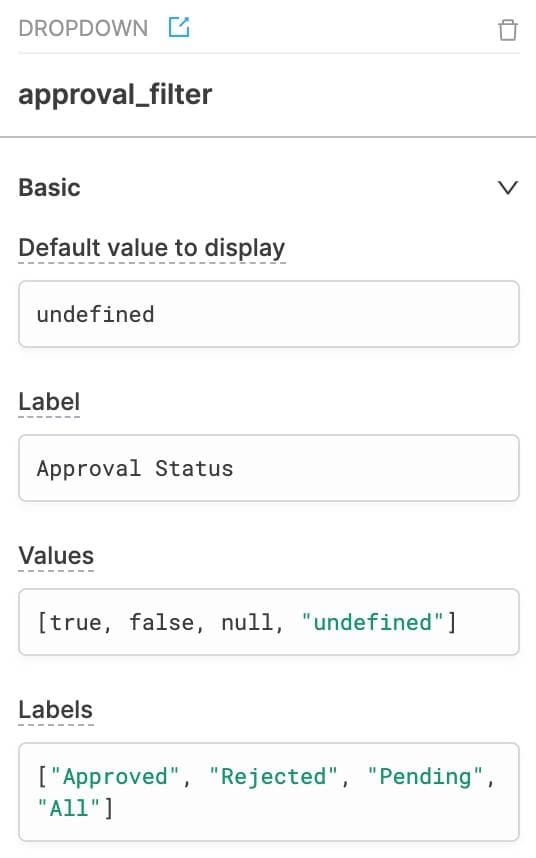 In the dropdown component, values map to labels in order, so when the Dropdown shows “Approved” it maps to true on the backend, when it shows “Rejected” it maps to false, and so on and so forth. Let’s also make sure we choose the “listings” query in the “on select” parameter on the right sidebar so the listings query reruns every time the approval_filter
