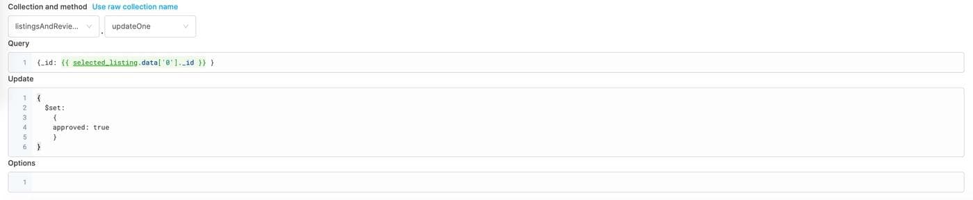 into the “query” field. In the “update” field, we’ll put a MongoDB statement that updates the approved field to true: