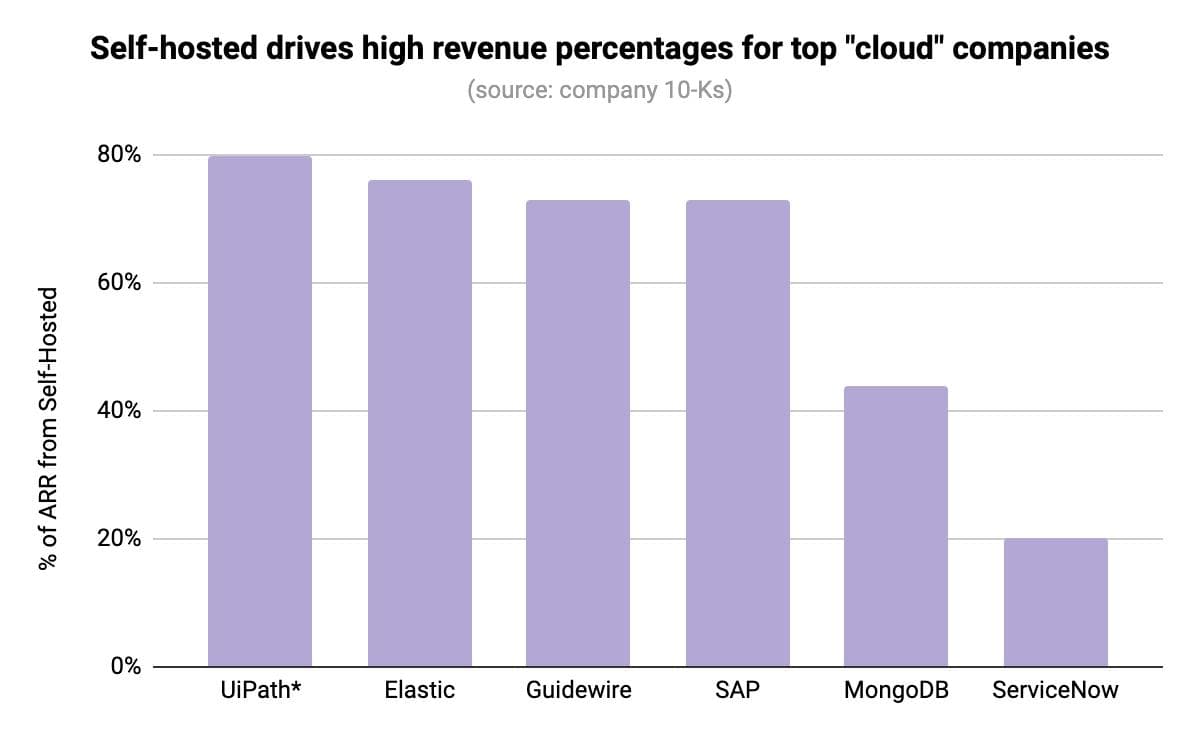 Surprisingly, many “cloud” companies make most of their revenue from self-hosted deployments. For example, the pioneers of “the cloud”—ServiceNow, MongoDB, UiPath, and others—all make billions of dollars of ARR from self-hosted software. Even Elastic makes more than 70% of their revenue from “on-premise” customers.