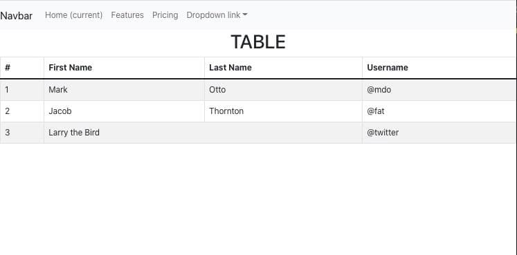 <nav className="navbar navbar-expand-lg navbar-light bg-light"> <a className="navbar-brand" href="#"> Navbar </a> <button className="navbar-toggler" type="button" data-toggle="collapse" data-target="#navbarNavDropdown" aria-controls="navbarNavDropdown" aria-expanded="false" aria-label="Toggle navigation" > <span className="navbar-toggler-icon"></span> </button> <div className="collapse navbar-collapse" id="navbarNavDropdown"> <ul className="navbar-nav"> <li className="nav-item active"> <a className="nav-link" href="#"> Home <span className="sr-only">(current)</span> </a> </li> <li className="nav-item"> <a className="nav-link" href="#"> Features </a> </li> <li className="nav-item"> <a className="nav-link" href="#"> Pricing </a> </li> <li className="nav-item dropdown"> <a className="nav-link dropdown-toggle" href="#" id="navbarDropdownMenuLink" data-toggle="dropdown" aria-haspopup="true" aria-expanded="false" > Dropdown link </a> <div className="dropdown-menu" aria-labelledby="navbarDropdownMenuLink"> <a className="dropdown-item" href="#"> Action </a> <a className="dropdown-item" href="#"> Another action </a> <a className="dropdown-item" href="#"> Something else here </a> </div> </li> </ul> </div> </nav>