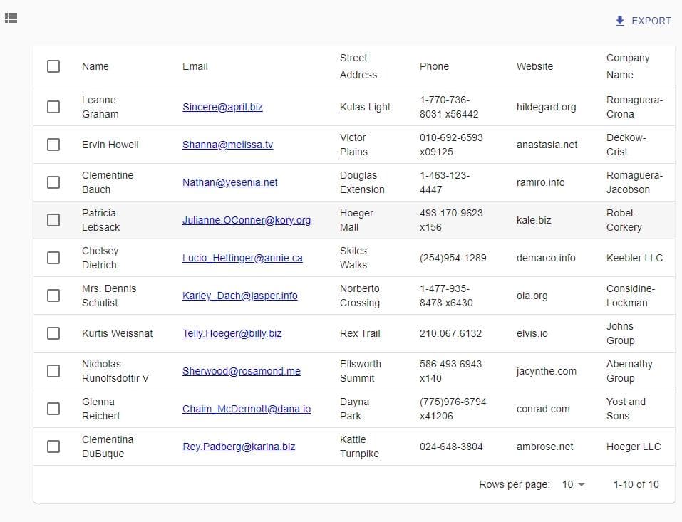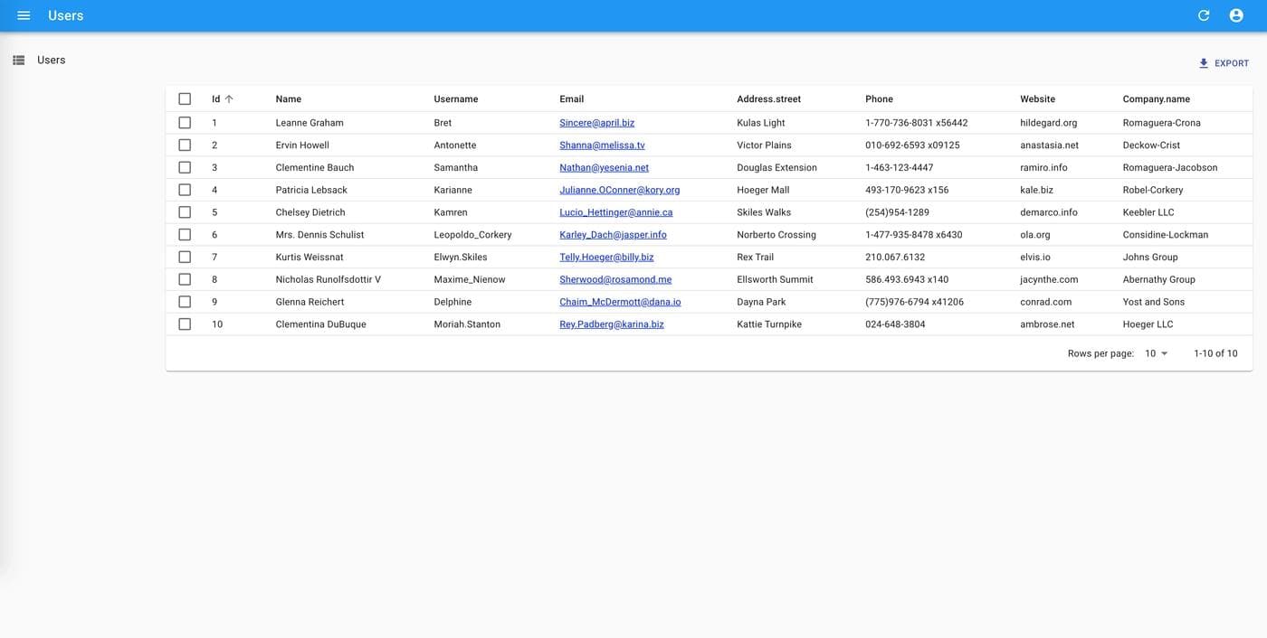 import React from 'react'; import { List, Datagrid, TextField, EmailField } from 'react-admin'; export const UserList = props => ( <List {...props}> <Datagrid rowClick="edit"> <TextField source="id" /> <TextField source="name" /> <TextField source="username" /> <EmailField source="email" /> <TextField source="address.street" /> <TextField source="phone" /> <TextField source="website" /> <TextField source="company.name" /> </Datagrid> </List> );