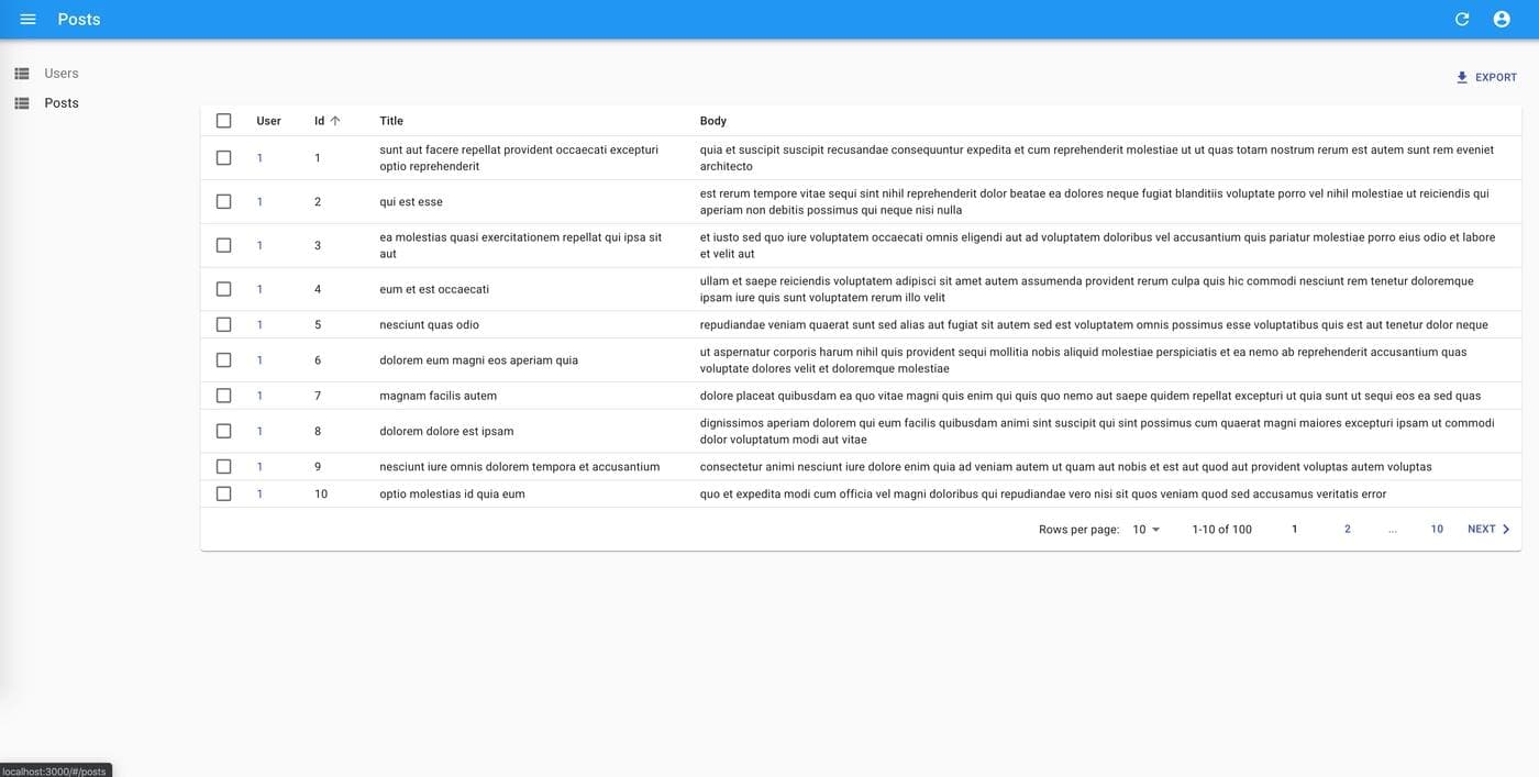 import React from 'react'; import { Admin } from 'react-admin'; import jsonServerProvider from 'ra-data-json-server'; //connect the data provider to the REST endpoint const dataProvider = jsonServerProvider('https://jsonplaceholder.typicode.com'); function App() { return ( <Admin dataProvider={dataProvider} /> ); } export default App;