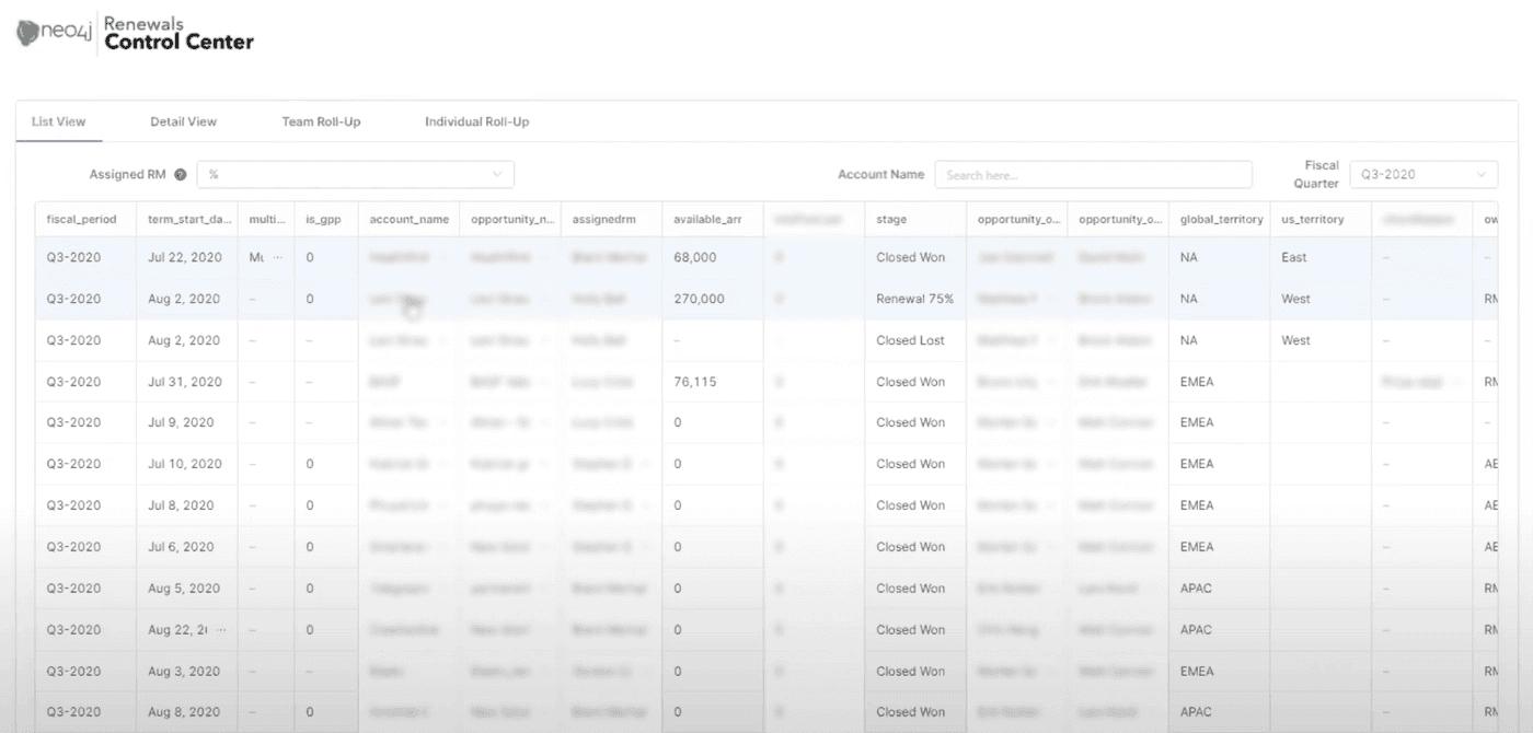 With the RCC, Mike can easily track the stage of each renewal and even filter by rep. He now has a clear understanding of the work his team is doing and knows where to deploy reps to make sure renewals are completed without a hitch. What's more, the RCC gives every rep a broad overview of their accounts, complete with extra details that were often left out of Salesforce profiles. These might include the reason for churn, contract details, or personal notes about a contact.