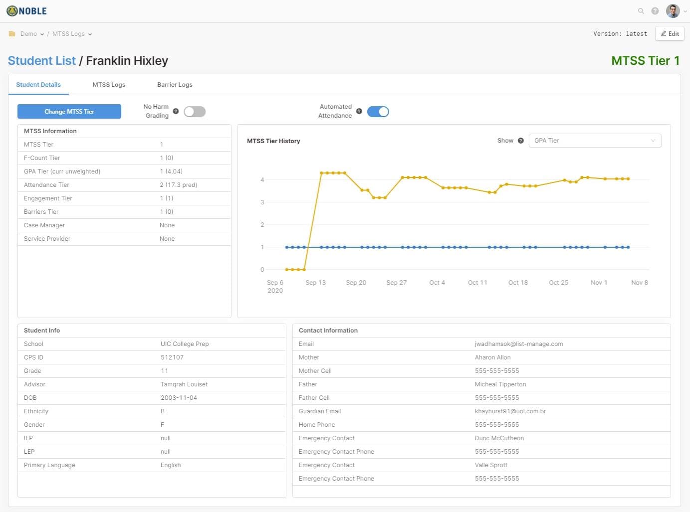 Moon built a Multi-Tiered System of Support (MTSS), a tool used within Noble's education systems to track the learning and well-being of students. MTSS is used to track attendance and as a report generating tool that tracks barriers to learning and overall performance to assist teachers in identifying students who need extra help.