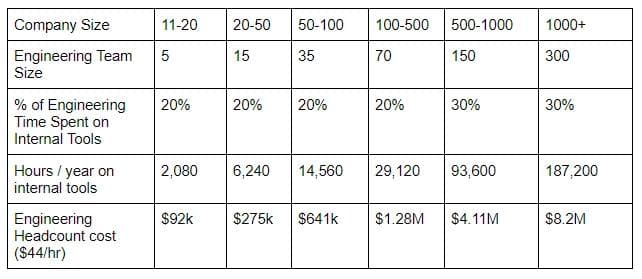 According to Glassdoor, the national average pay for a software engineer is roughly $92,000 a year. Now, if you’re in an industry that uses many custom internal tools (say, financial services and logistics), the math for this is pretty simple. You’d probably have at least one (maybe more) software engineers working full time on internal tools, so you’d just multiply that average by however many full-time folks you’d need.