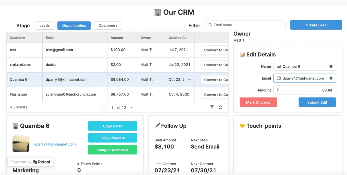 For example, you could enrich your list of leads above with data from your own Gmail, such that it shows when you last contacted each person.You could also connect Retool to Clearbit’s API to enrich leads directly in the sheet you use.