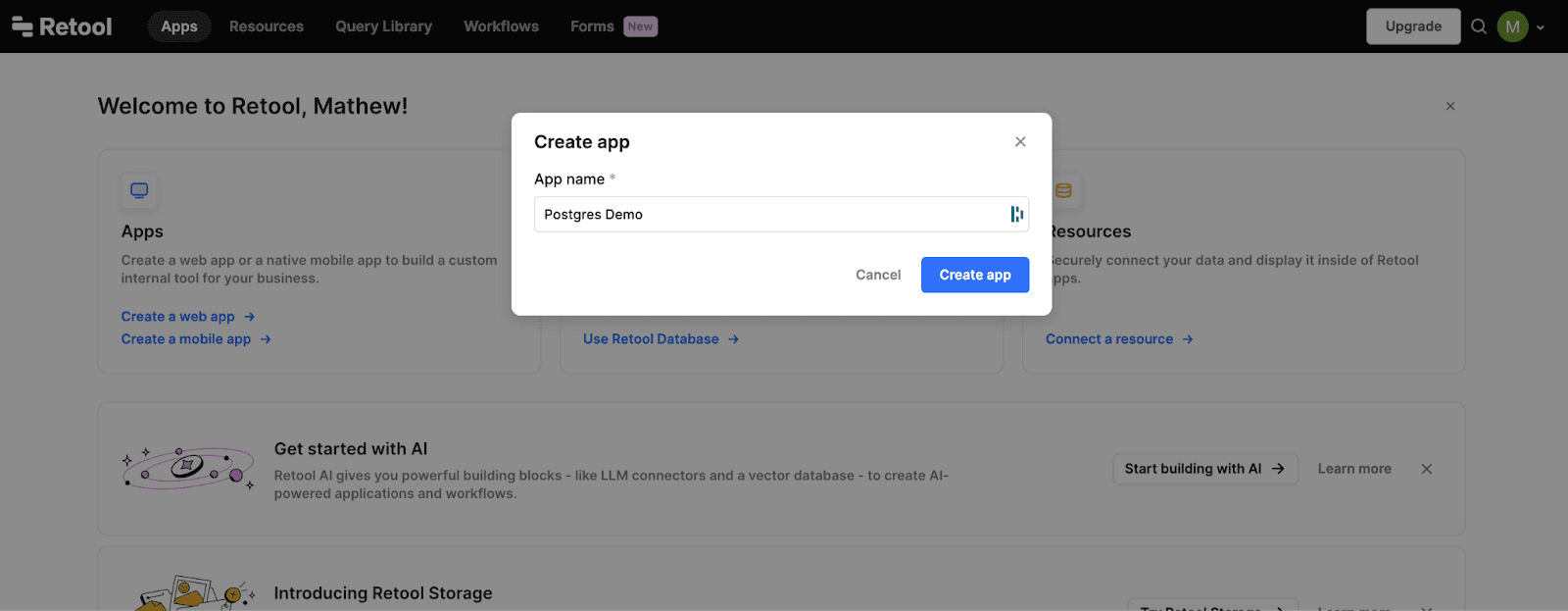 To build your own PostgreSQL GUI, we’re going to use an internal tools platform to avoid sinking time into building frontend components from scratch. I’m using Retool for this tutorial given its advanced feature set, though the same principles can apply no matter how you opt to build your GUI.