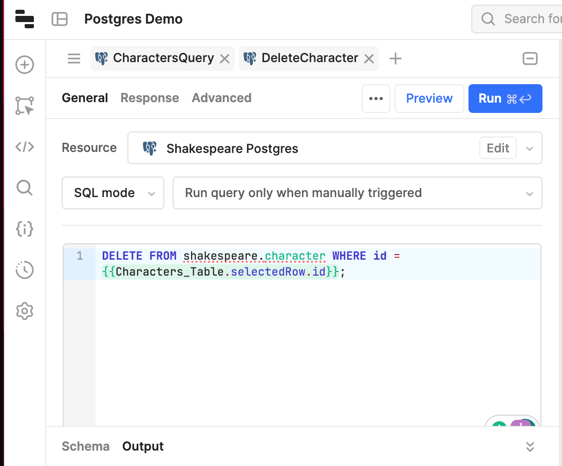 First, we’ll need to set up the query that tells the database to delete the selected row. Thankfully, this is easy by using the prebuilt selectedRow feature on Retool, which enables us to write a WHERE clause to ensure we’re deleting the right row, identified via the id field.