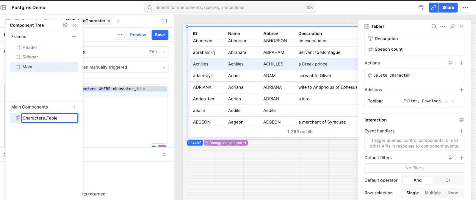 Now that we have a working query, we need to feed it into a component. Given that we did a generic SELECT query, we’ll use a UI table to display the data in spreadsheet format. Conveniently, there’s a Retool prebuilt component made for this task: