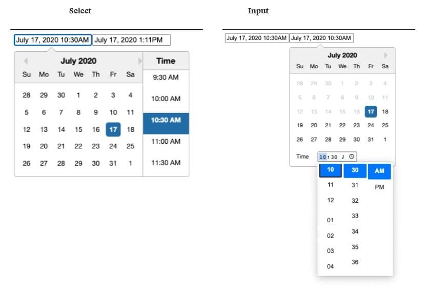 While the input version can be very useful since it lets the user type in any time they want, we’re going to go with the select version because we’re okay with only letting our customer support reps choose times in half-hour increments.