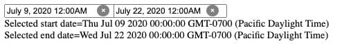 <div> <div style={{ display: "flex" }}> <DatePicker ... /> <DatePicker ... /> </div> <div>Selected start date={startDate ? startDate.toString() : null}</div> <div>Selected end date={endDate ? endDate.toString() : null}</div> </div>