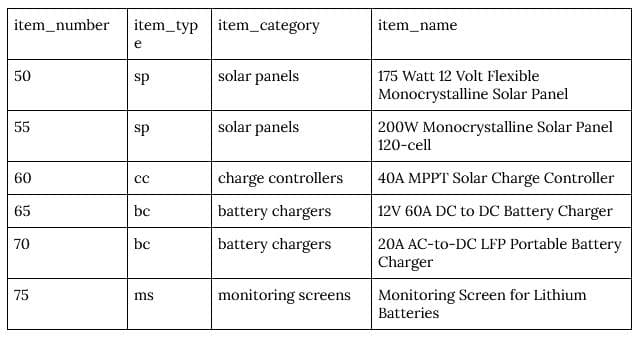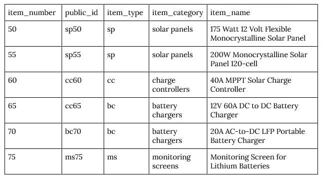 INSERT INTO Inventory (item_type, item_category, item_name) VALUES ('sp','solar panels','175 Watt 12 Volt Flexible Monocrystalline Solar Panel'), ('sp','solar panels','200W Monocrystalline Solar Panel 120-cell'), ('cc','charge controllers','40A MPPT Solar Charge Controller'), ('bc','battery chargers','12V 60A DC to DC Battery Charger'), ('bs','battery chargers','20A AC-to-DC LFP Portable Battery Charger '), ('ms','monitoring screens','Monitoring Screen for Lithium Batteries'); UPDATE Inventory SET public_id = concat(item_type, item_number);