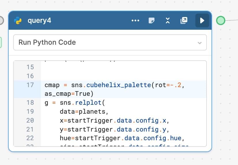 We’ll create a file buffer in the Python block, then save our visualization into that file buffer. We can now return that image (in svg/pdf/png/jpg format) as the output of the block. We’re almost done!