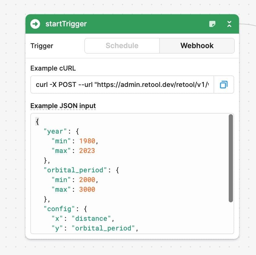 For example, let’s create a webhook-based workflow. By flipping the Start Trigger block to webhook mode, we’ll automatically get a URL endpoint that we can send POST requests to. And, we can specify the shape of a JSON input to reference later—for example, the attributes on various axes, or filters to apply.