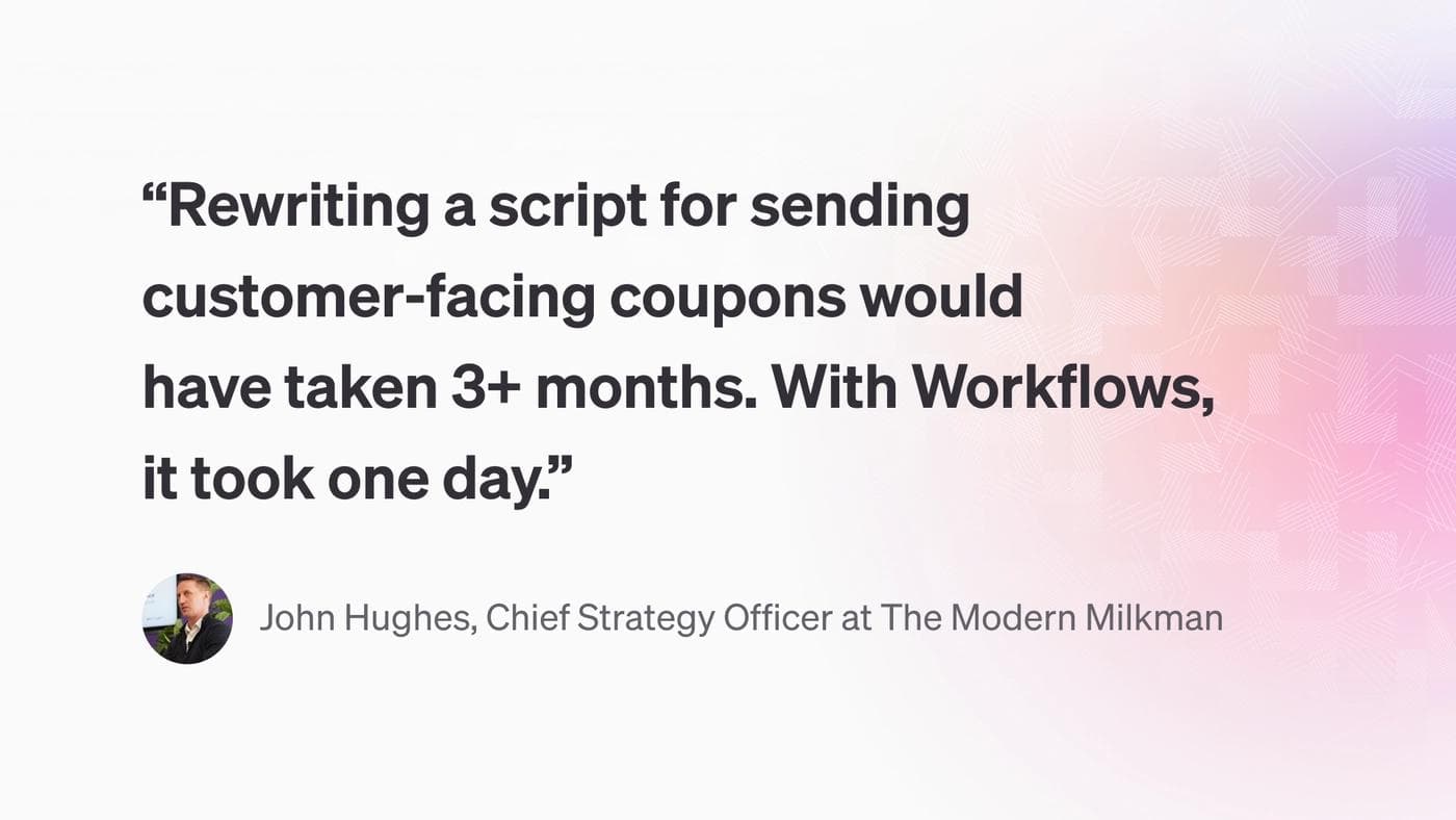 Companies like Motive, Cameo, RE/MAX, Best Western Hotels, and The Modern Milkman have used Workflows to automate all kinds of manual tasks.