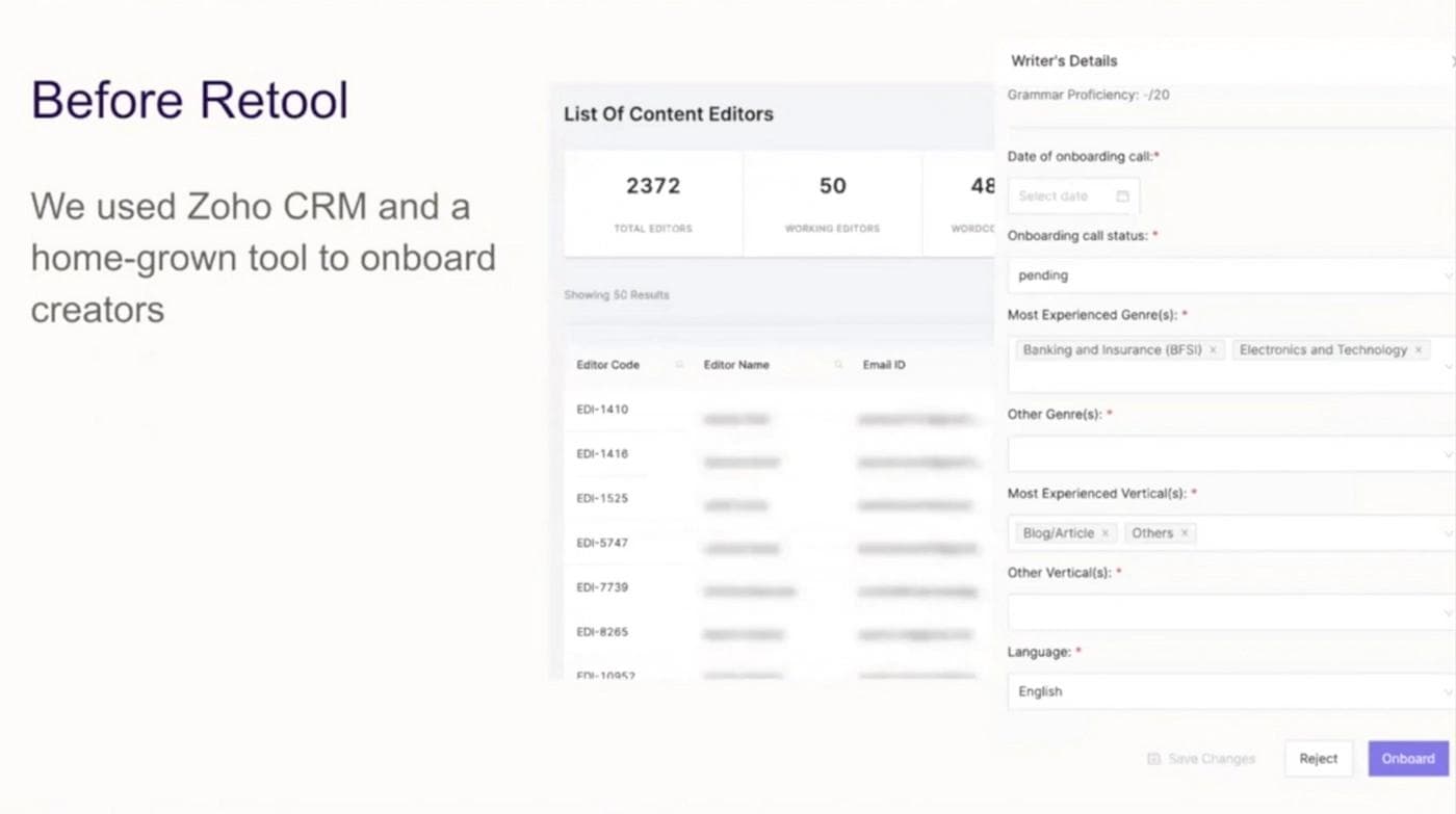 Initially, the team relied on Zoho CRM and a home-grown tool to evaluate and onboard creators. Their operations portal included several lengthy forms that were built from scratch, each component created by an engineer at Pepper Content. As a result, it presented several scaling problems.