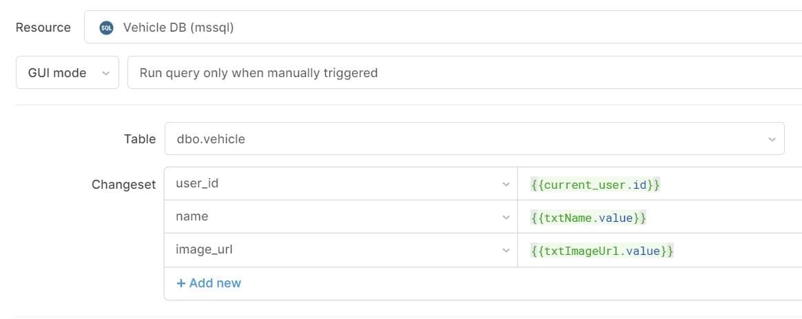 Now that the dialog is closing when you click Save, you can add another event handler to write the new vehicle entry to the database. Click New again and select Create a New Query in the “Query” dropdown.