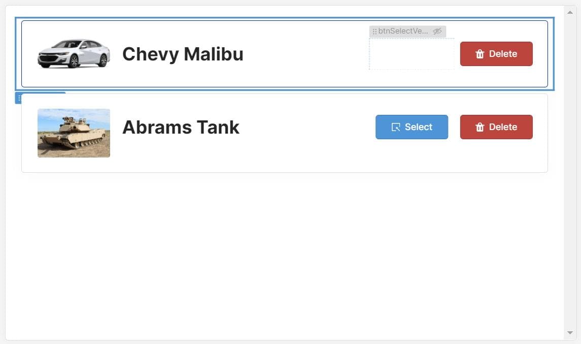 In the inspector, go to the Layout section. Set the “Hidden” property so that when the selected vehicle is equal to the current vehicle’s id, it resolves to true: {{localStorage.values.selectedVehicle == ListVehicles.data.vehicle_id[i]}}
