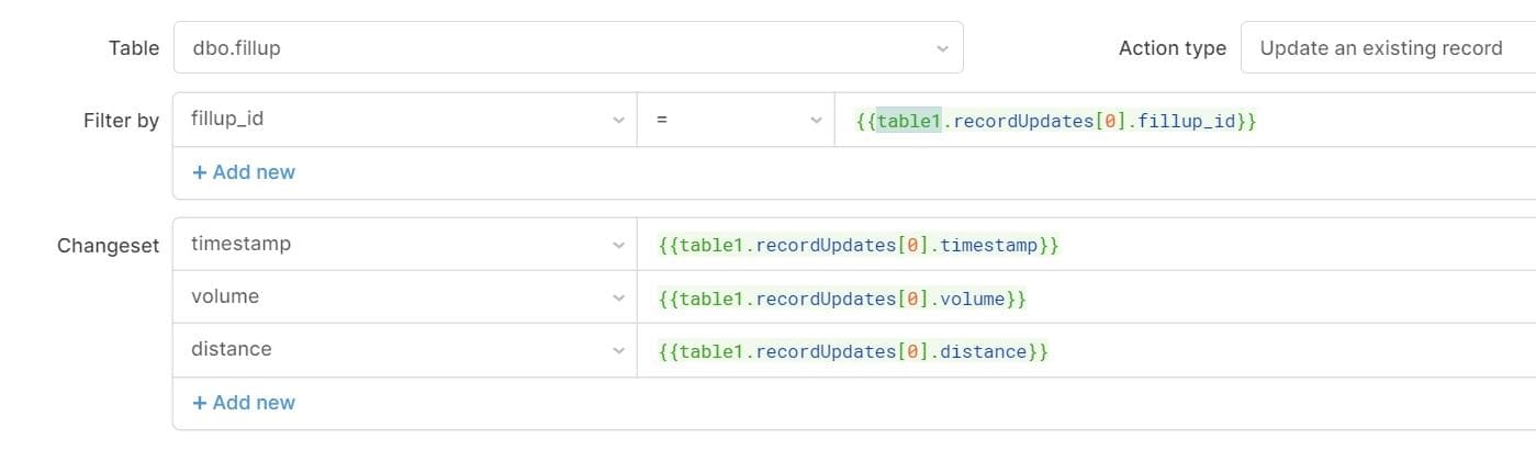 values to the changeset. Again, make sure you add an event handler to the query that runs the “ListFillups” query. Give the query a name and save it.