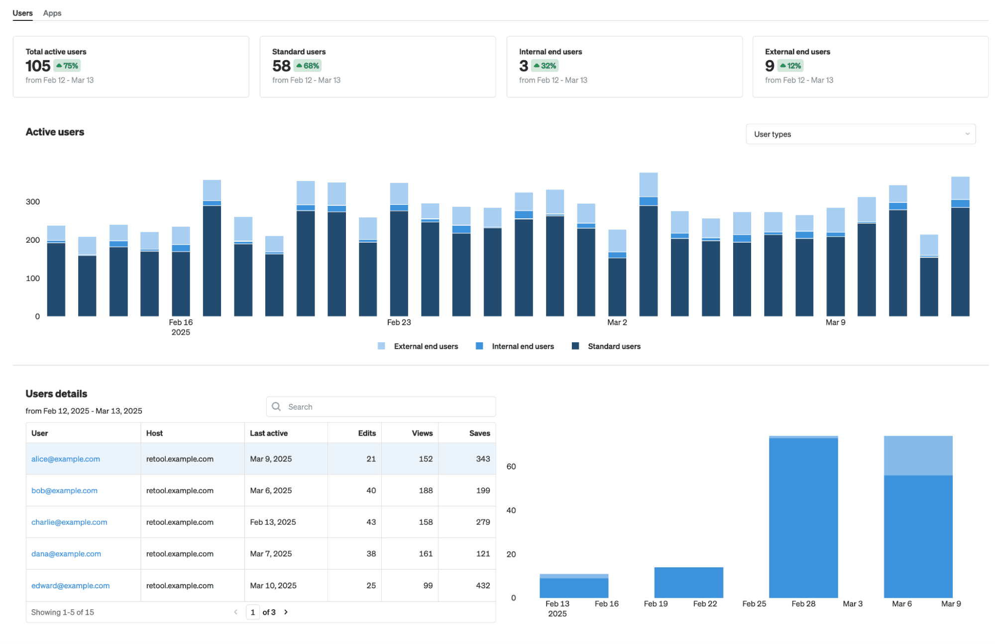 Monitor Retool adoption and usage across your entire deployment with our revamped Usage Analytics dashboard. The redesigned dashboard gives admins improved oversight with a more organized, tab-based interface that breaks down Monthly Active Users by user type (Standard, End, and External) and application types (Mobile, Web). With enhanced Usage Analytics, you can track external user engagement, filter by specific apps and users, and identify adoption patterns.