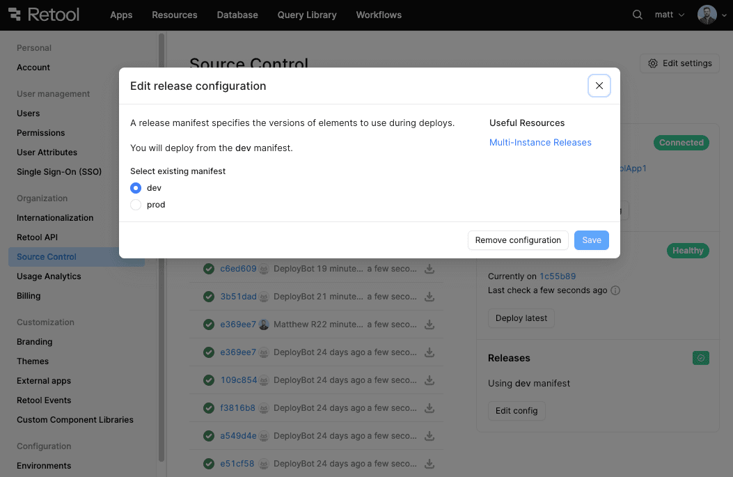 The new multi-instance releases feature lets you cut and deploy consistent versions of your apps across development environments. You can define which release version of your app should be live on each instance through a simple manifest file stored in your repository, enabling structured promotion workflows from dev to staging to production.