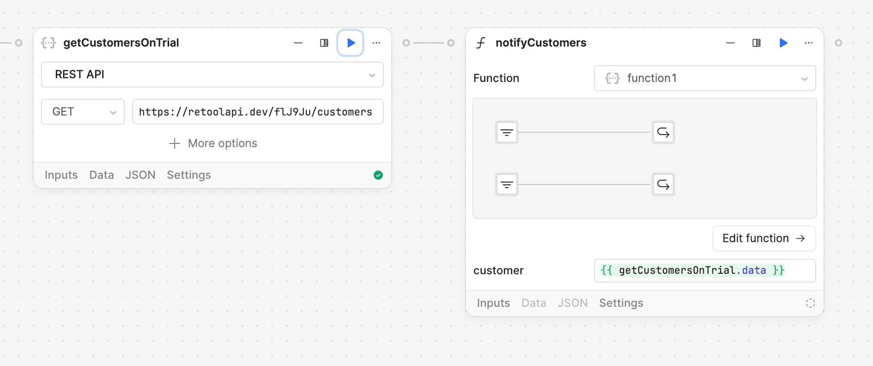 Create reusable, self-contained workflows with control flow that you can call from anywhere. Unlike single-step functions, these package complex operations with multiple steps into one component, complete with parameters, outputs, and internal logic. This simplifies complex workflows, reduces duplicate code, and creates more maintainable automations.