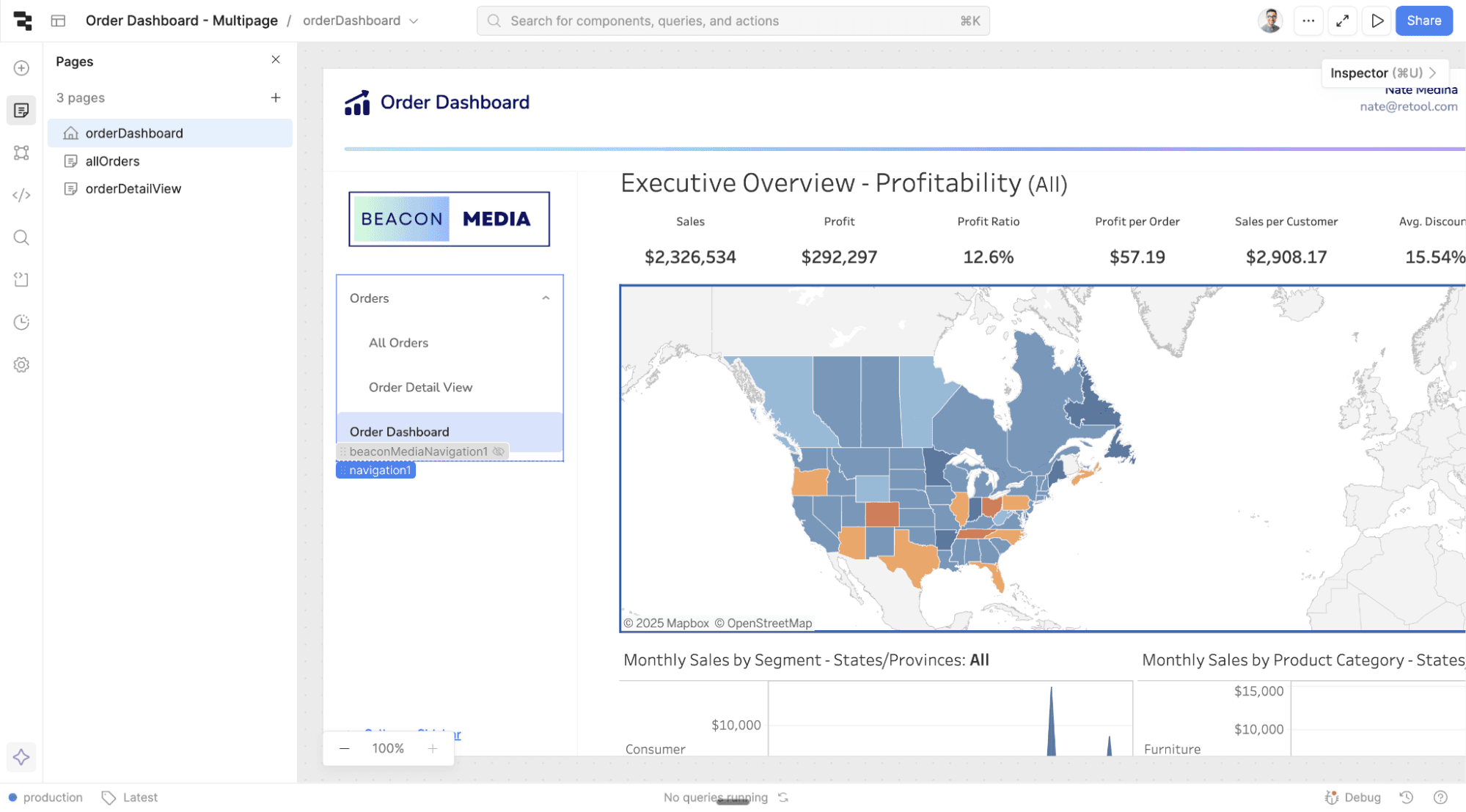 Multipage apps are now the default building experience, giving you a better foundation for complex applications. As many of you already know, multipage apps consolidate several separate apps into a single, more maintainable application. Defaulting to this architecture delivers 27% faster load times on average—Retool only evaluates the code and components on the current page and not the entire application.
