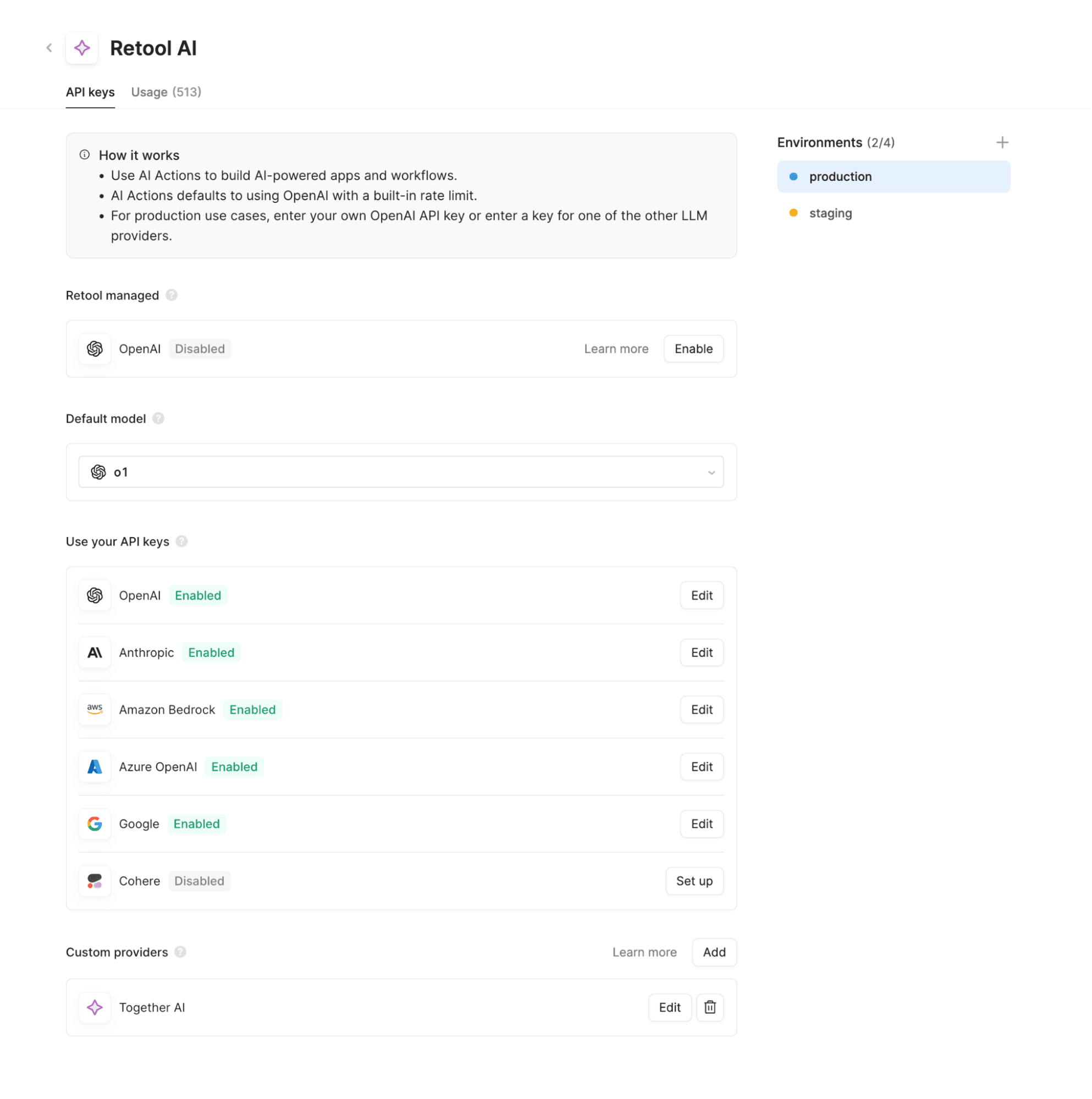 We’re continuously updating model options to keep your apps and workflows future-ready. Stay up-to-date on the latest model updates in our edge releases. You can also use custom providers or our REST API connector to add your preferred AI model to any app.