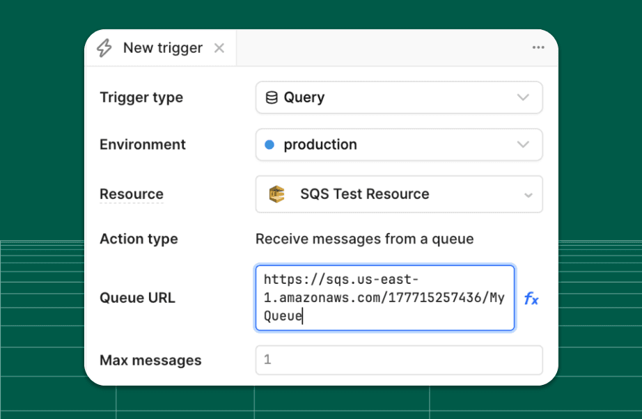 Query triggers—our new trigger type in Retool Workflows—let you poll messages from SQS, SNS, Kafka on intervals or cron schedules, and trigger workflow runs when messages are received. This means that any glue code or brittle homegrown processing pipelines can now find a home as maintainable workflows in Retool, all while keeping your existing distributed system intact.