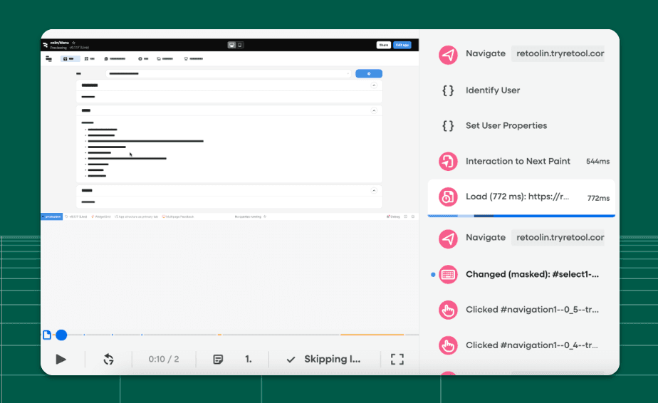 Session replay is now in private beta for Enterprise customers on both Cloud and self-hosted Retool version 3.114+. Reach out to your account team to get started.