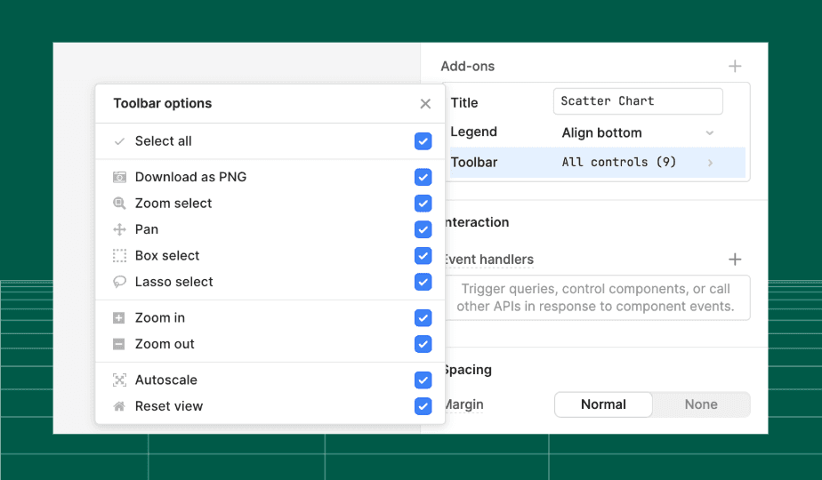 Say goodbye to writing Plotly JSON each time you need to step into more advanced data visualization. Our legacy Chart component has now evolved into a suite of 15 robust preset options—from classics like bar, line, and scatter, to new chart types like sankey, heat map, mixed chart, sunburst, and more. Each chart gives you a set of expanded charting properties like: