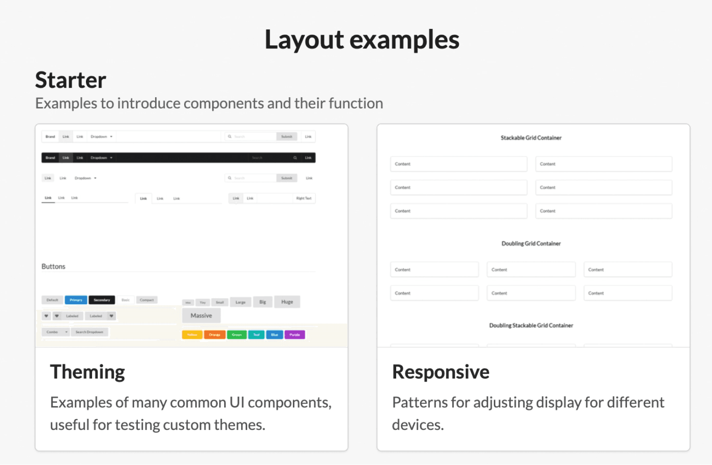 In addition to theming, Semantic UI React provides layout examples for using grids, responsive design, sticky nav, webpage construction, etc. These layouts offer a useful starting point vs. starting from a blank slate.