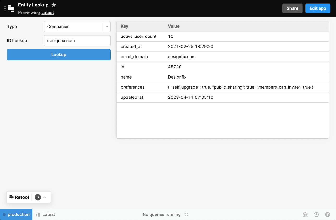 1) Create a new App in Retool. I’ll call mine Entity Lookup.