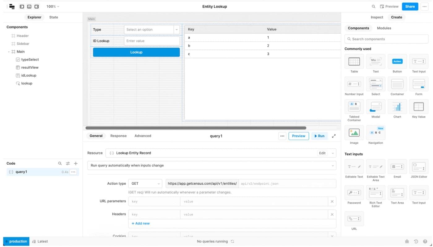 . (For more information on how this API works, see the Census Entity API docs.) - Go ahead and save this new resource. You’ll end up with an entry under Code called query1. Rename it to lookup_entities.