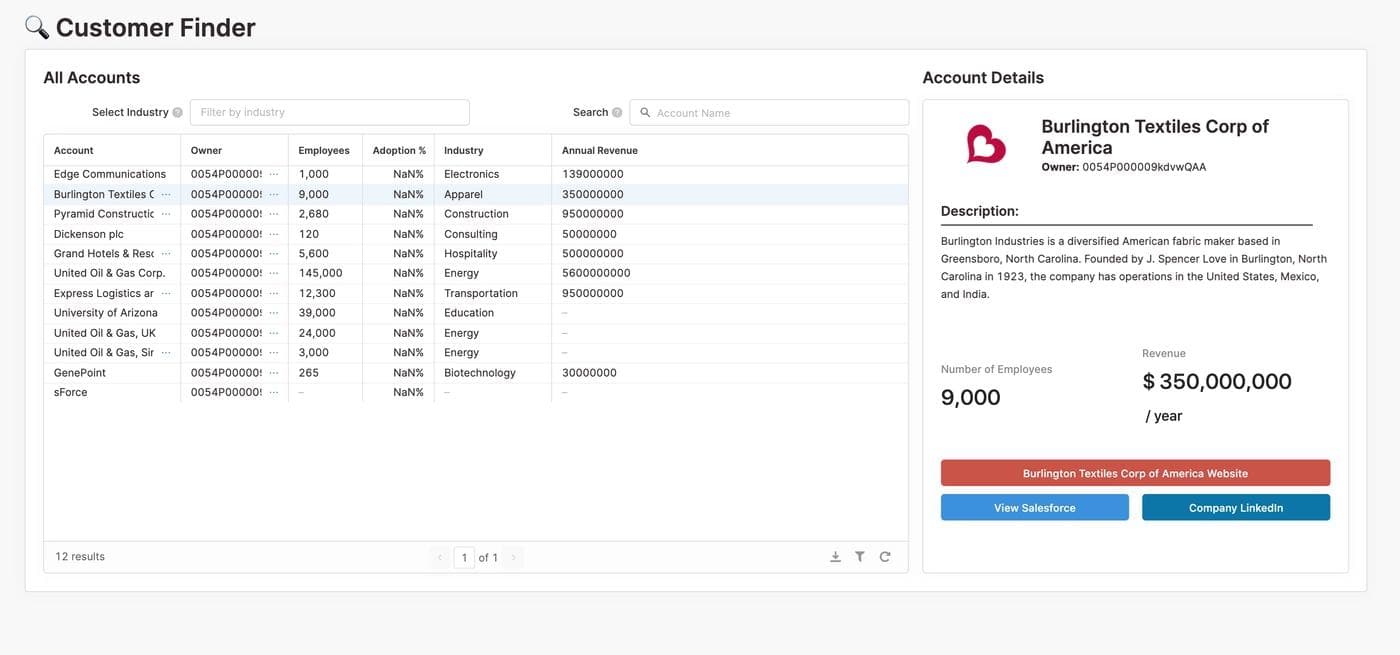 - Learning about our customers. We don’t need to dig up notes or post on Slack to get the scoop on a customer. We’re able to use this tool to quickly access any relevant links for a given account, explore which teams we currently work with, and build bridges between departments to ensure that we're adding the most value possible to their organization.