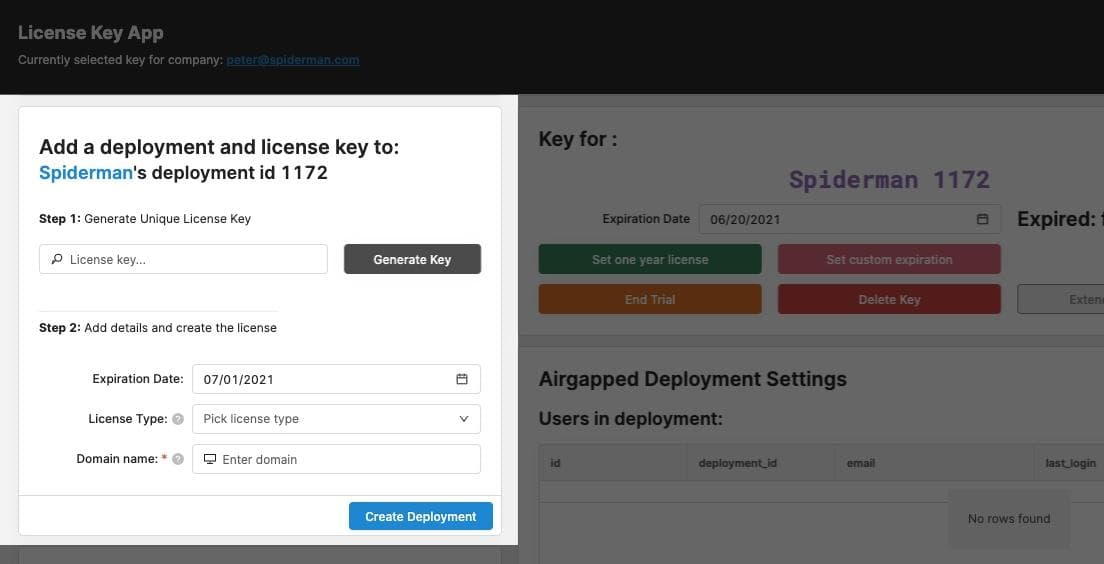 Once a company has been added to our management database, we can generate a “deployment” for them. To generate a deployment, need a few things: a unique license key, an expiration date, a type, and a domain.